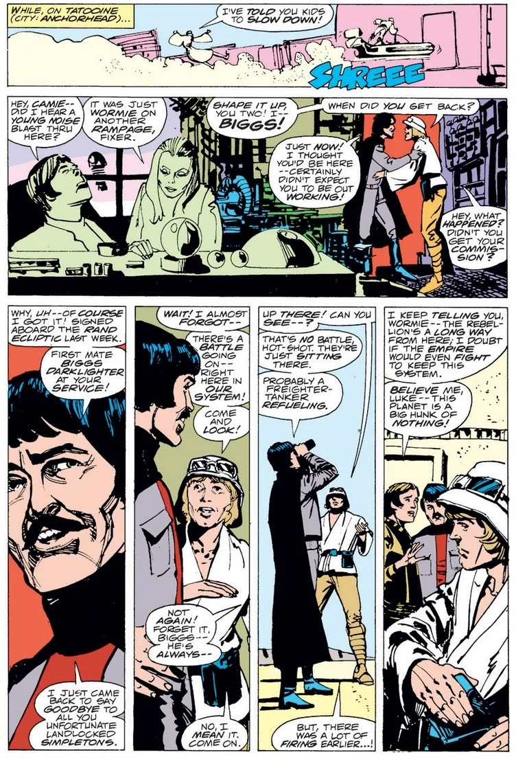 Look at it. It's flipping gorgeous. The name Star Wars had been firmly lodged in my dad's mind after that 2000AD Summer Special, and, bless him for knowing my early forming nerdy interests so well, picked it up on a whim. I have fond memories of laying on the floor, the comic spread in front of me, while I poured over every panel. Unknown to me, there were scenes in there that wouldn't make it into the final film – the now legendary sequences with Biggs and the Tosche Station. I absolutely loved it, but it was only half of the story!